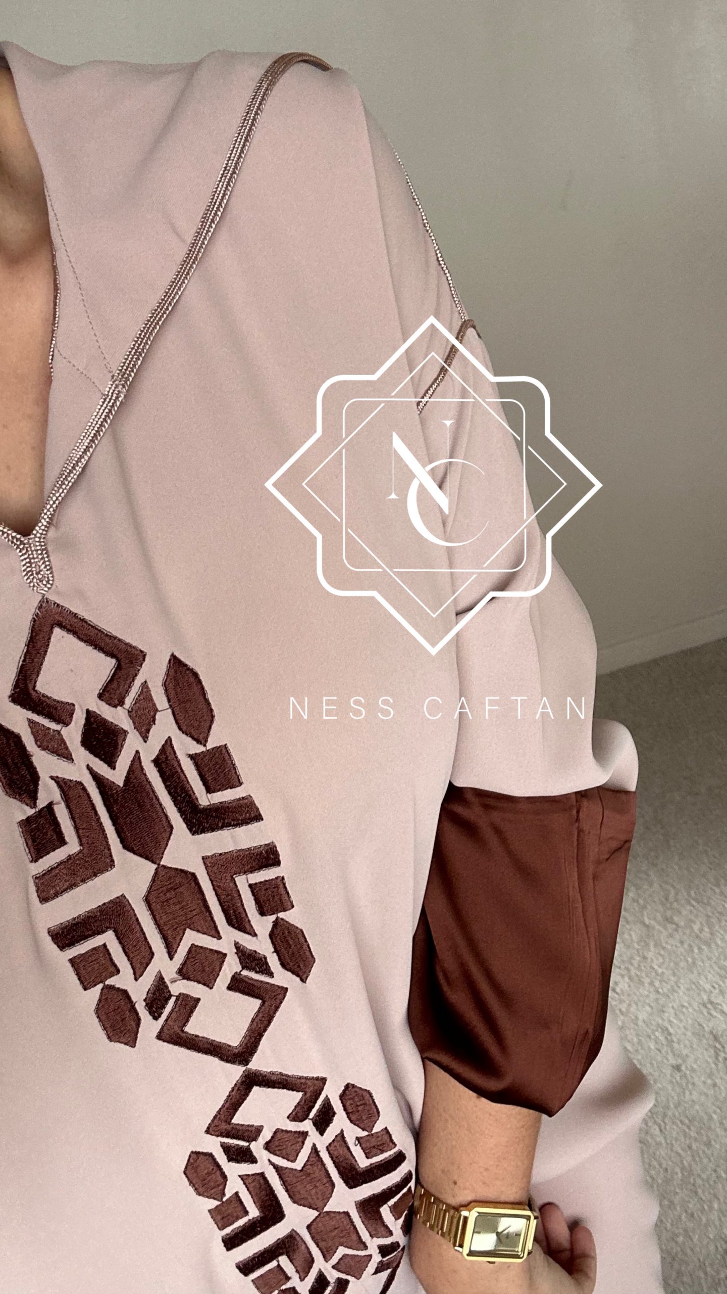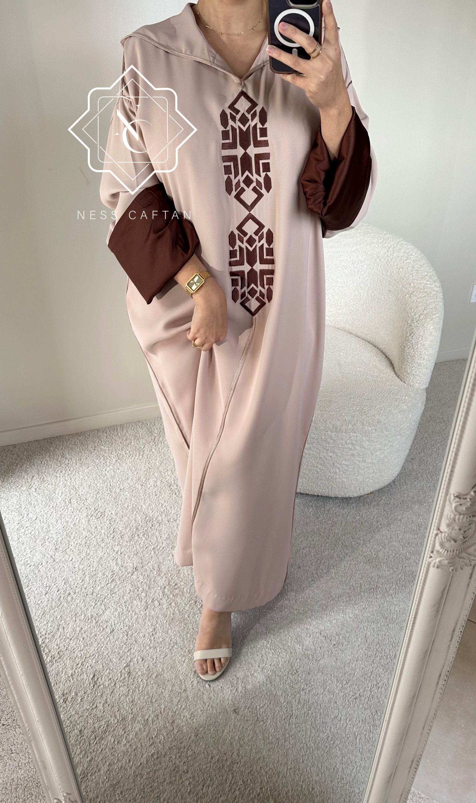 La djellaba Fatima beige/marron est un chef-d’œuvre de sophistication, brodée à la main avec des détails exquis. La finition des manches doublées renforce l’aspect haut de gamme de ce modèle. Fabriquée en crêpe de soie de qualité, cette djellaba combine confort et élégance, idéale pour des occasions spéciales où vous souhaitez impressionner tout en restant à l’aise.