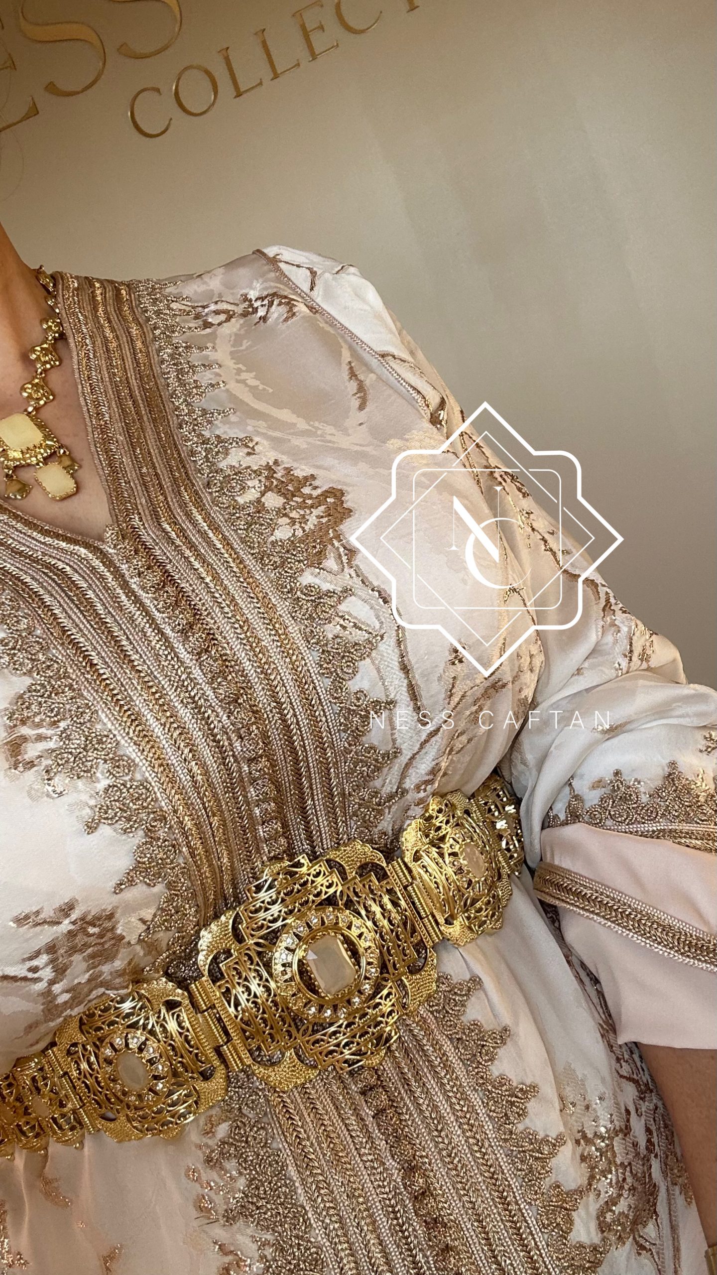 Cette magnifique takchita brochet de soie dans des tons blanc cassé et beige est l’incarnation de la grâce et de l’élégance. Le tissu en brochet de soie offre une texture douce et fluide, parfaite pour des occasions sophistiquées. Le dessous assorti garantit un confort optimal tout en maintenant un style harmonieux. Ce modèle se distingue par sa coupe intemporelle et ses détails raffinés.