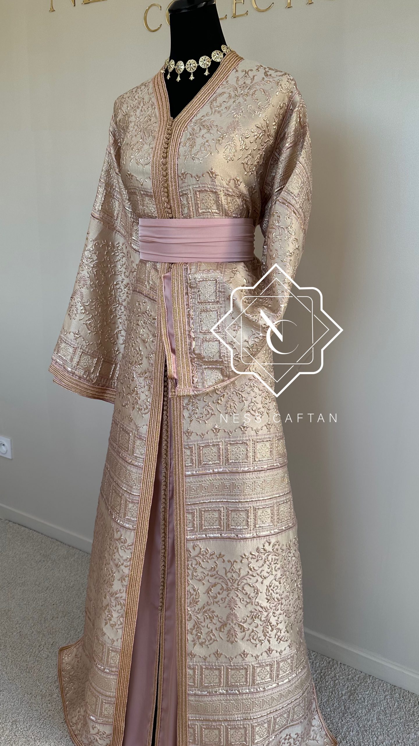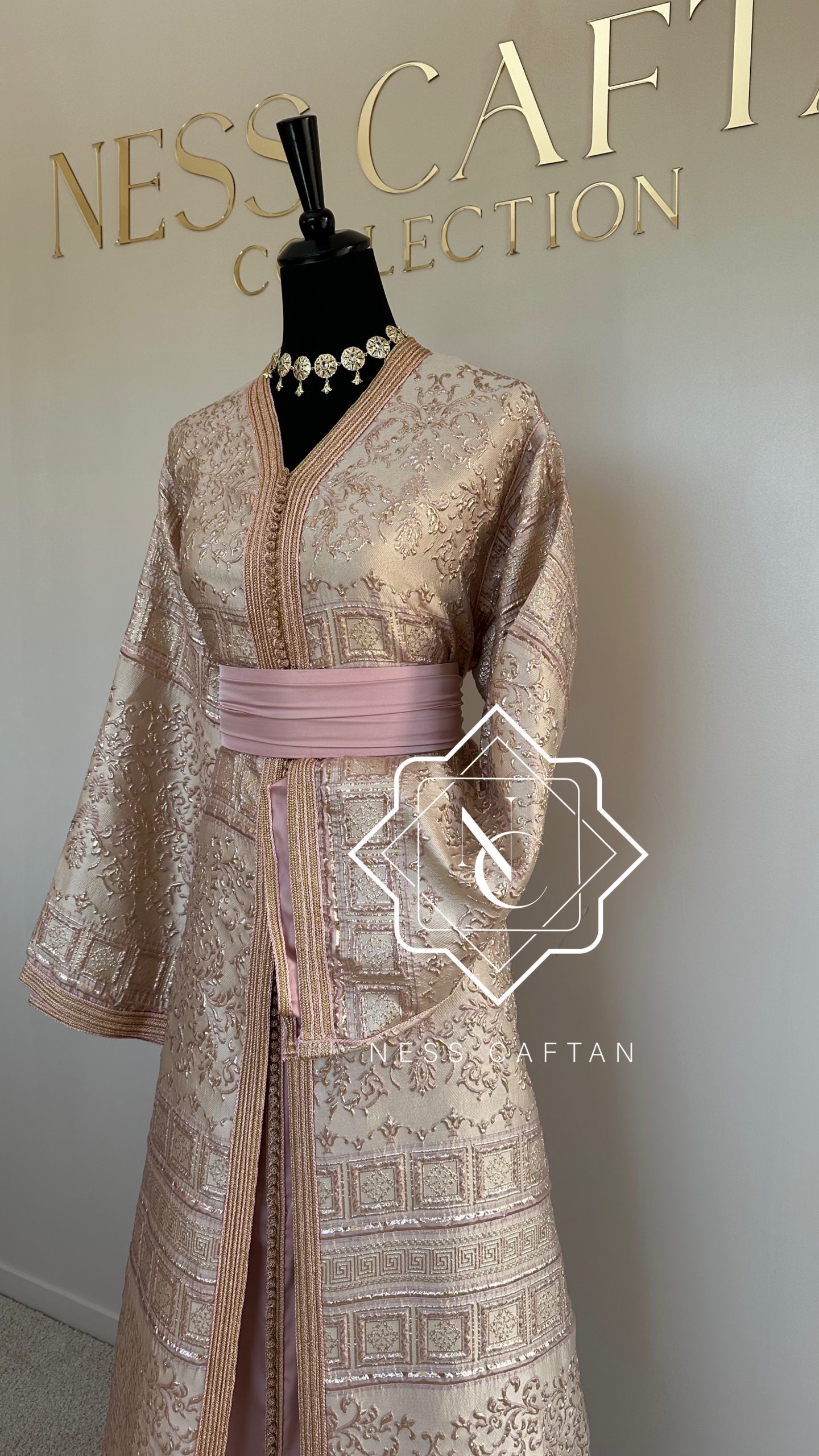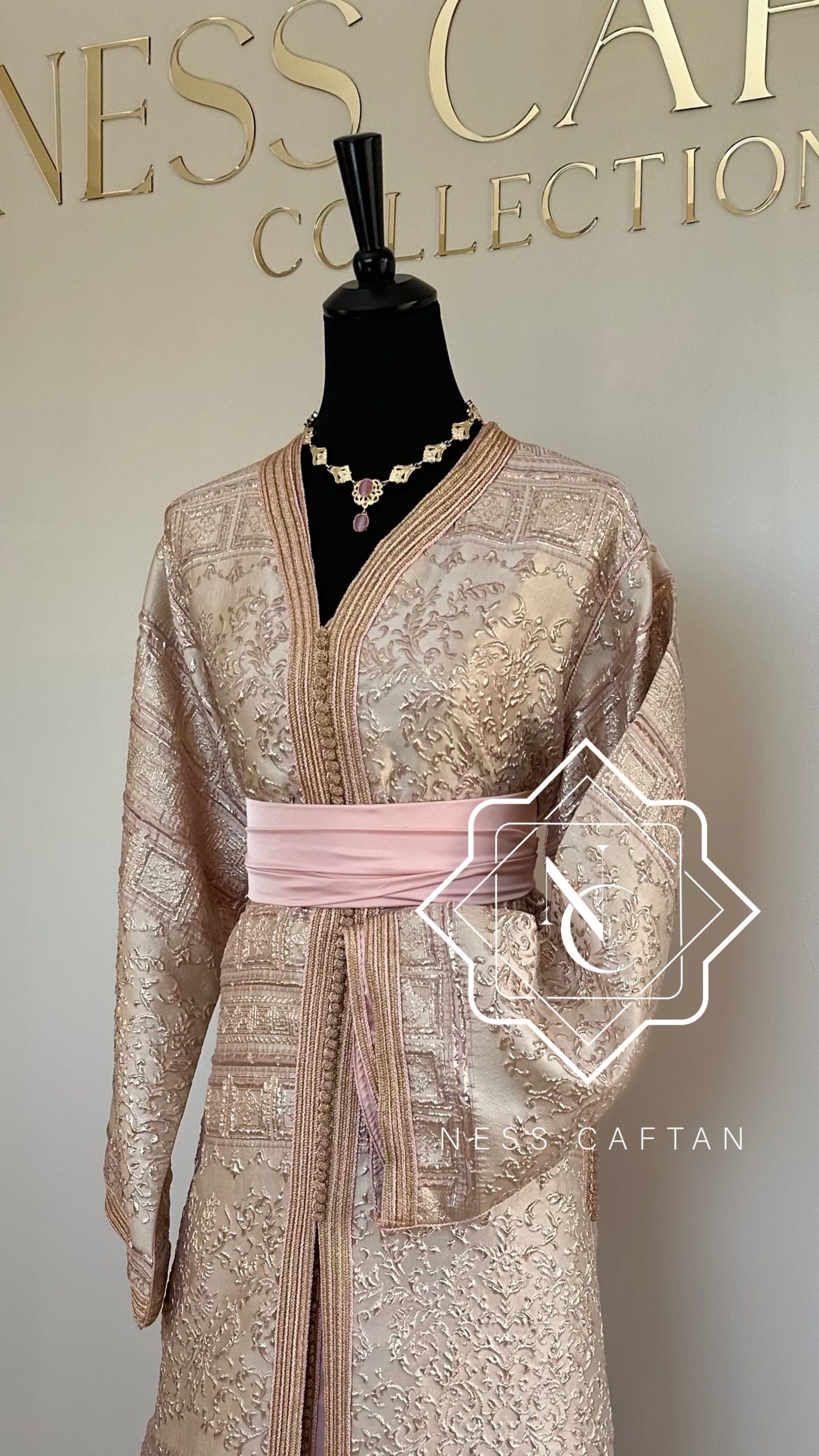 La takchita JOUNAÏDA est un chef-d’œuvre de sophistication. Conçu en tissu brochet ce caftan illumine la silhouette grâce à ses détails brillants et subtils qui captent la lumière avec chaque mouvement. Le tissu complète ce modèle en offrant un confort maximal. Cette takchita saura vous offrir une élégance discrète tout en vous permettant de briller avec style.