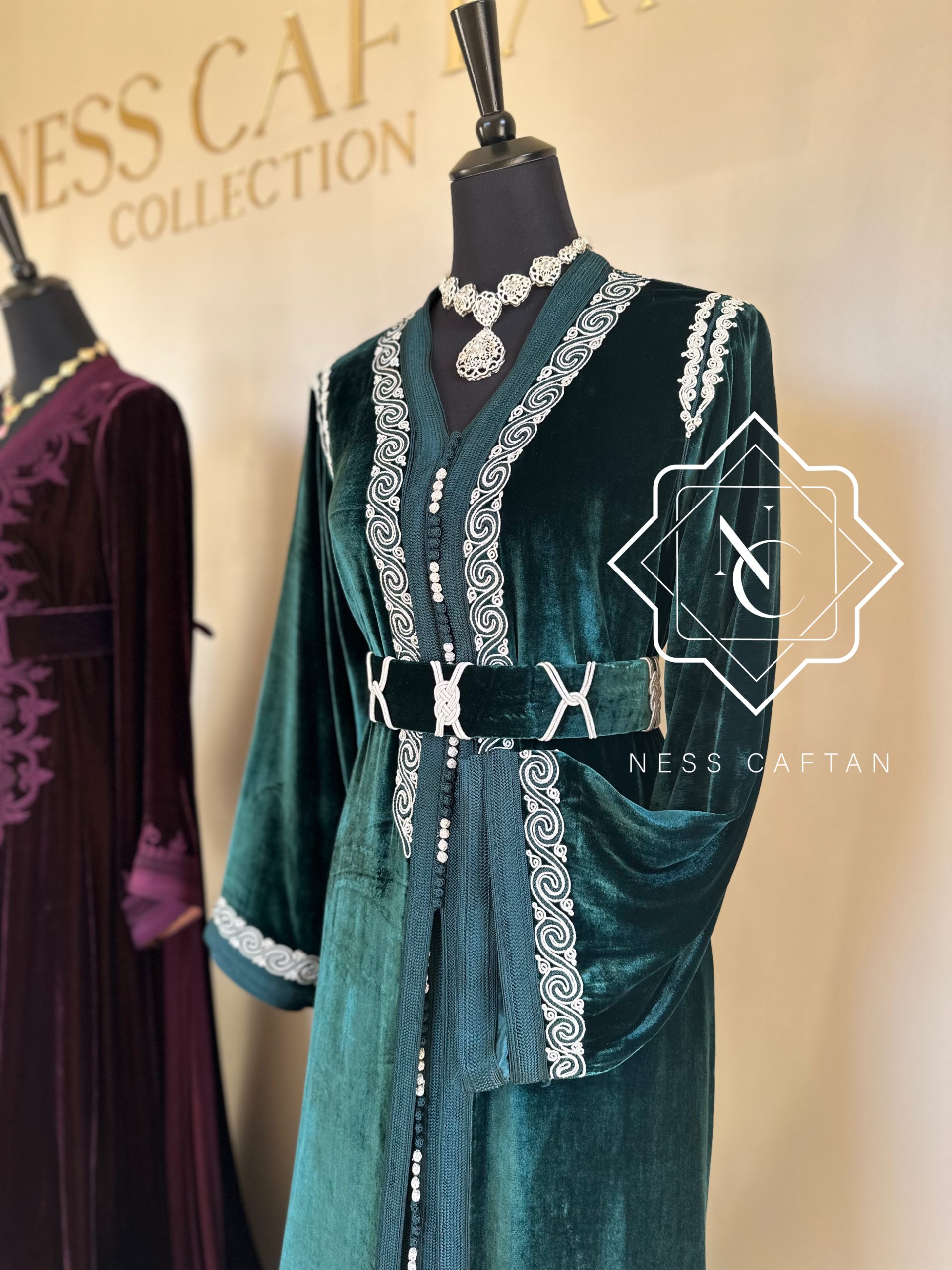 La takchita MWABRA VERT est un modèle spectaculaire, avec une finesse exceptionnelle. Le tissu en velours de soie fluide se mêle harmonieusement aux dessous brillant, créant une pièce de grande élégance. Ce modèle, parfait pour un événement ou un mariage, combine sophistication et modernité. La couleur verte et les broderies argentés de cette takchita ajoutent une touche de glamour, tandis que la coupe parfaitement ajustée met en valeur la silhouette.