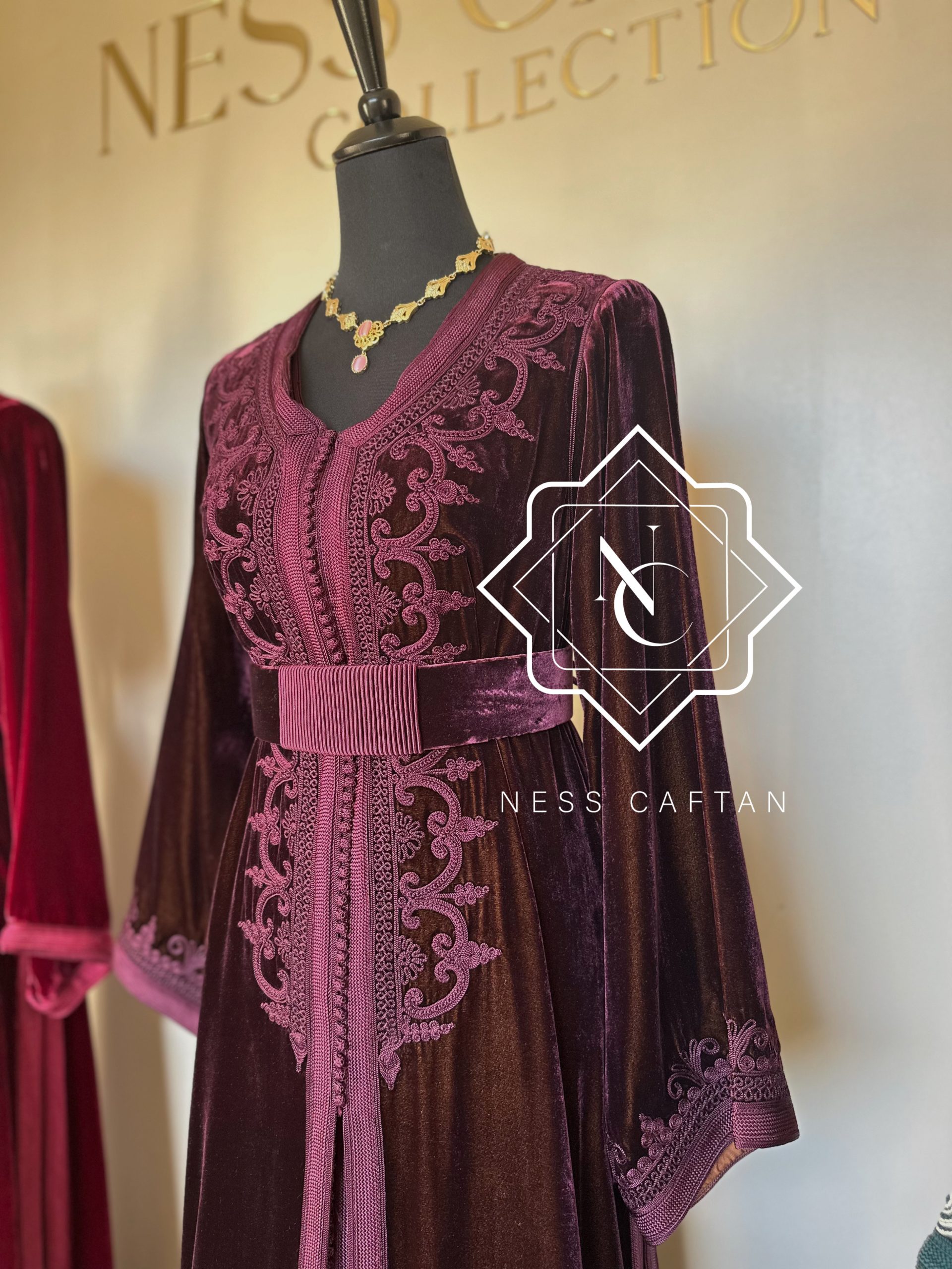 La takchita MWABRA VIOLET est un modèle spectaculaire, avec une finesse exceptionnelle. Le tissu en velours de soie fluide se mêle harmonieusement aux dessous brillant, créant une pièce de grande élégance. Ce modèle, parfait pour un événement ou un mariage, combine sophistication et modernité. La couleur violette et les broderies ton sur ton de cette takchita ajoutent une touche de glamour, tandis que la coupe parfaitement ajustée met en valeur la silhouette.