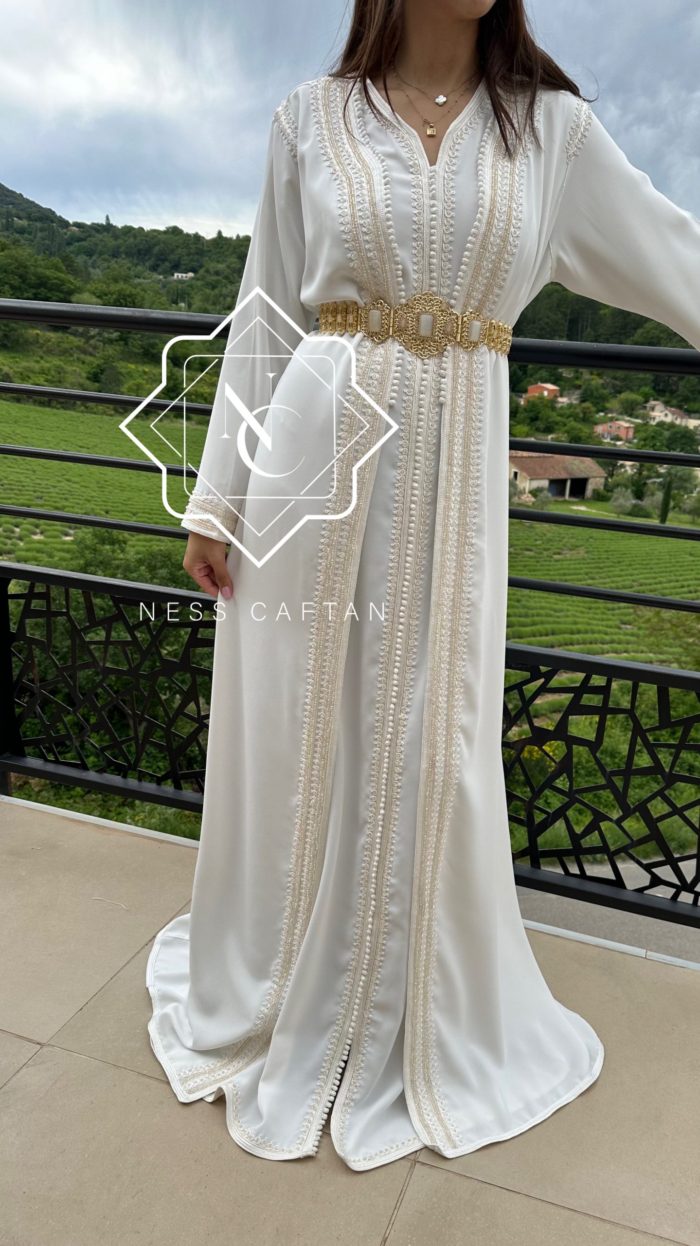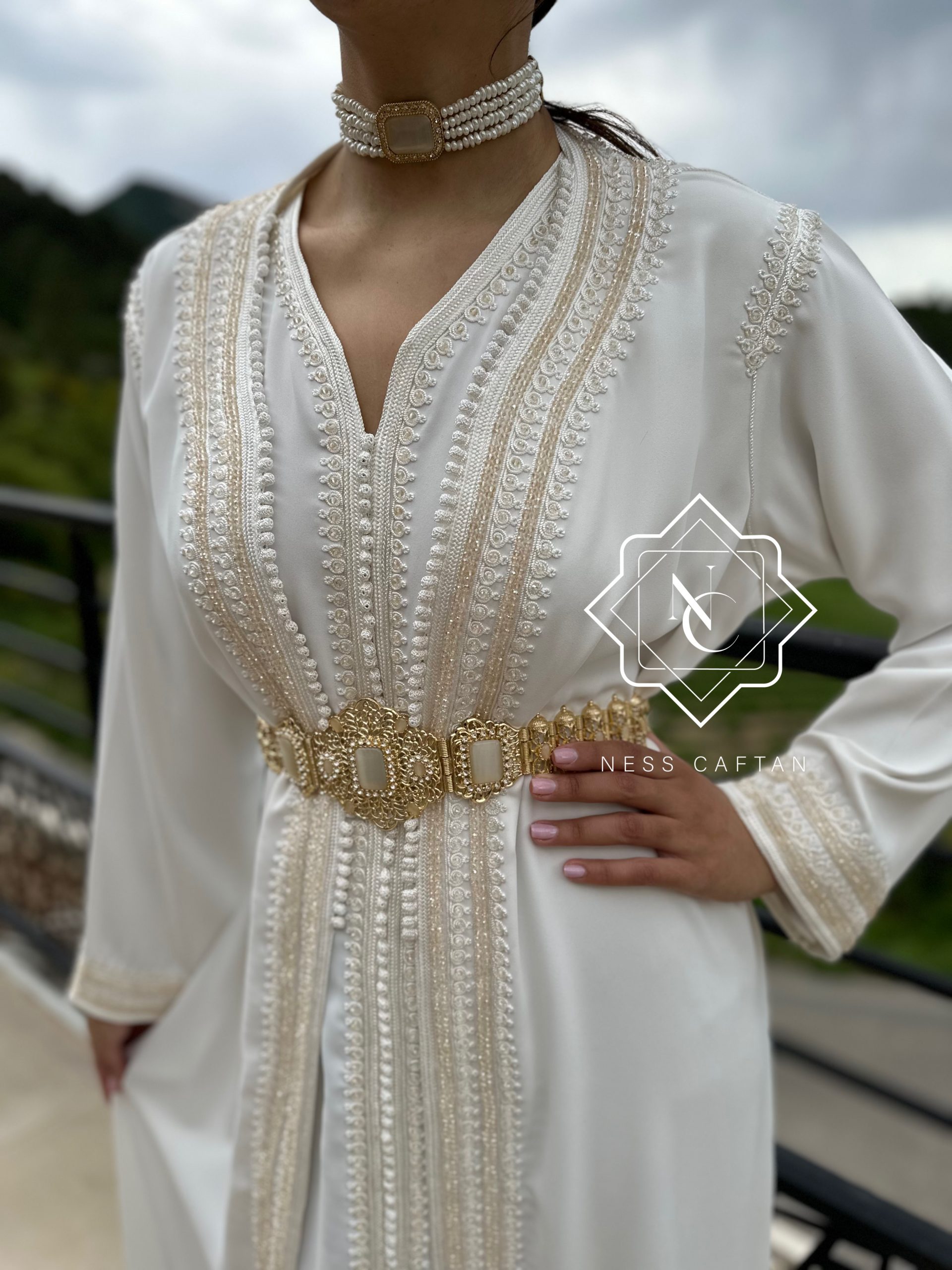 La takchita perlé Colombe est une véritable œuvre d’art, parsemée de perles délicates qui illuminent le tissu. Ce modèle combine l’élégance classique avec des touches modernes grâce à ses détails en perles raffinées. Une option parfaite pour des occasions spéciales où vous souhaitez porter quelque chose d’unique et d’élégant.