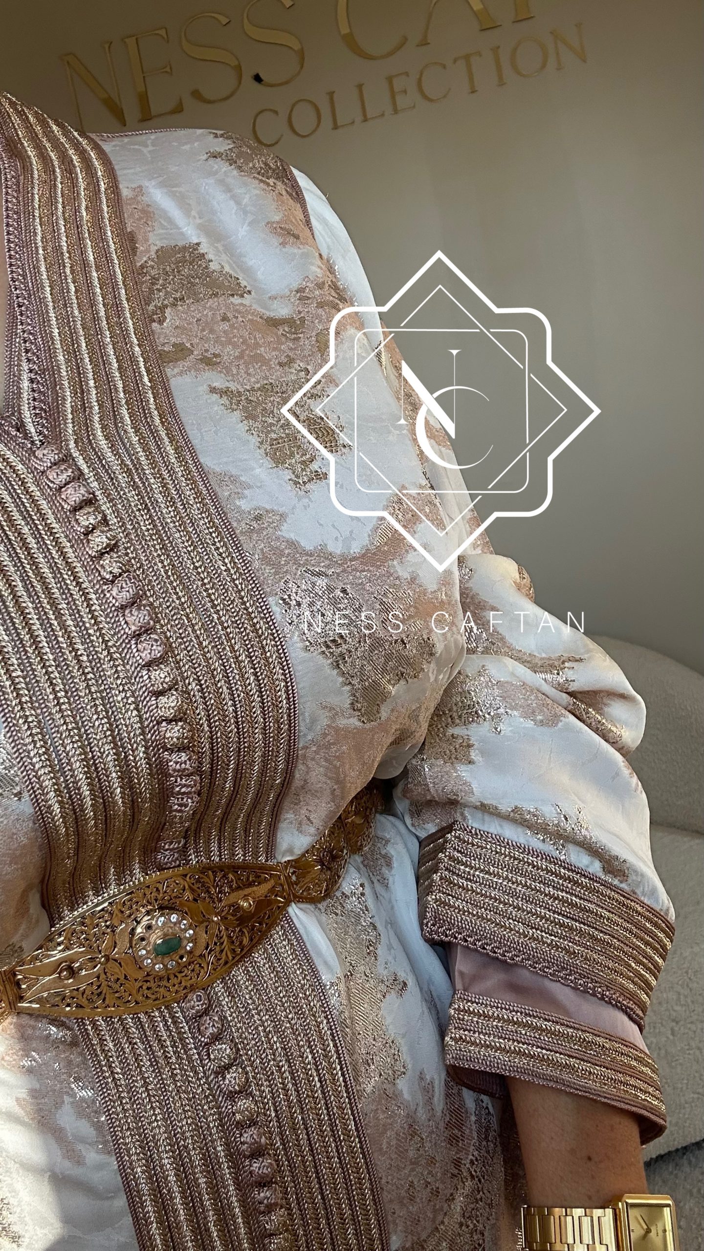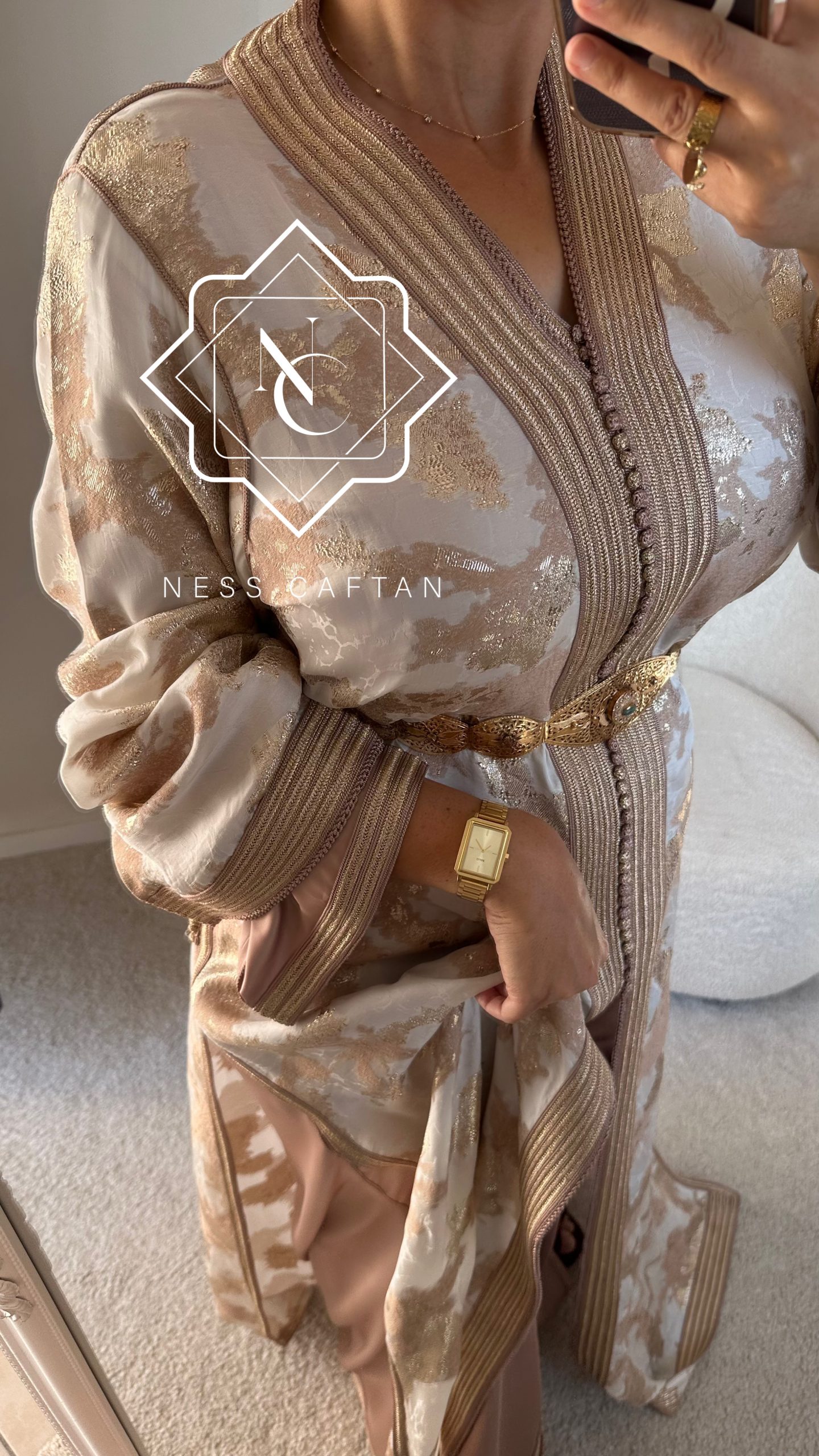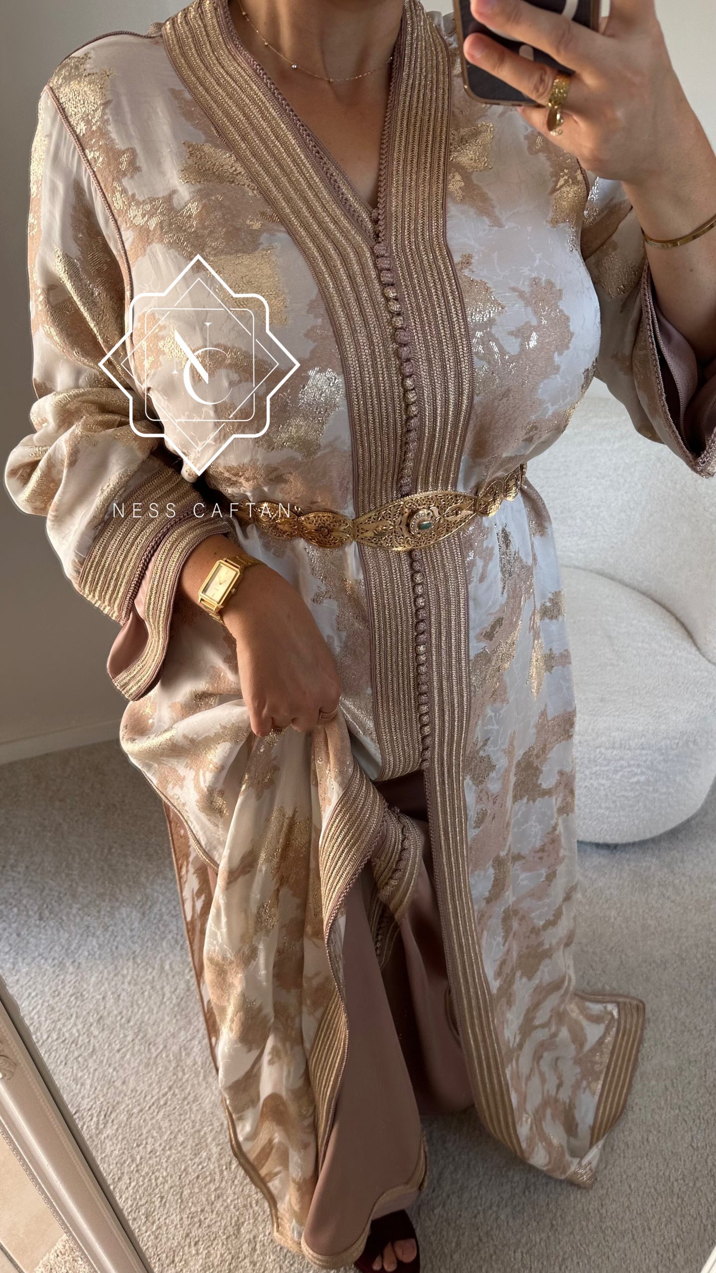 Cette takchita en brochet de soie beige, accompagnée d’un dessous parfaitement assorti, offre une silhouette épurée et raffinée. Le tissu léger et fluide en brochet de soie se drape magnifiquement, apportant confort et élégance à la personne qui la porte. Parfaite pour des événements tels que des mariages ou des réceptions, cette takchita allie modernité et tradition, grâce à sa coupe classique et ses détails minutieux.