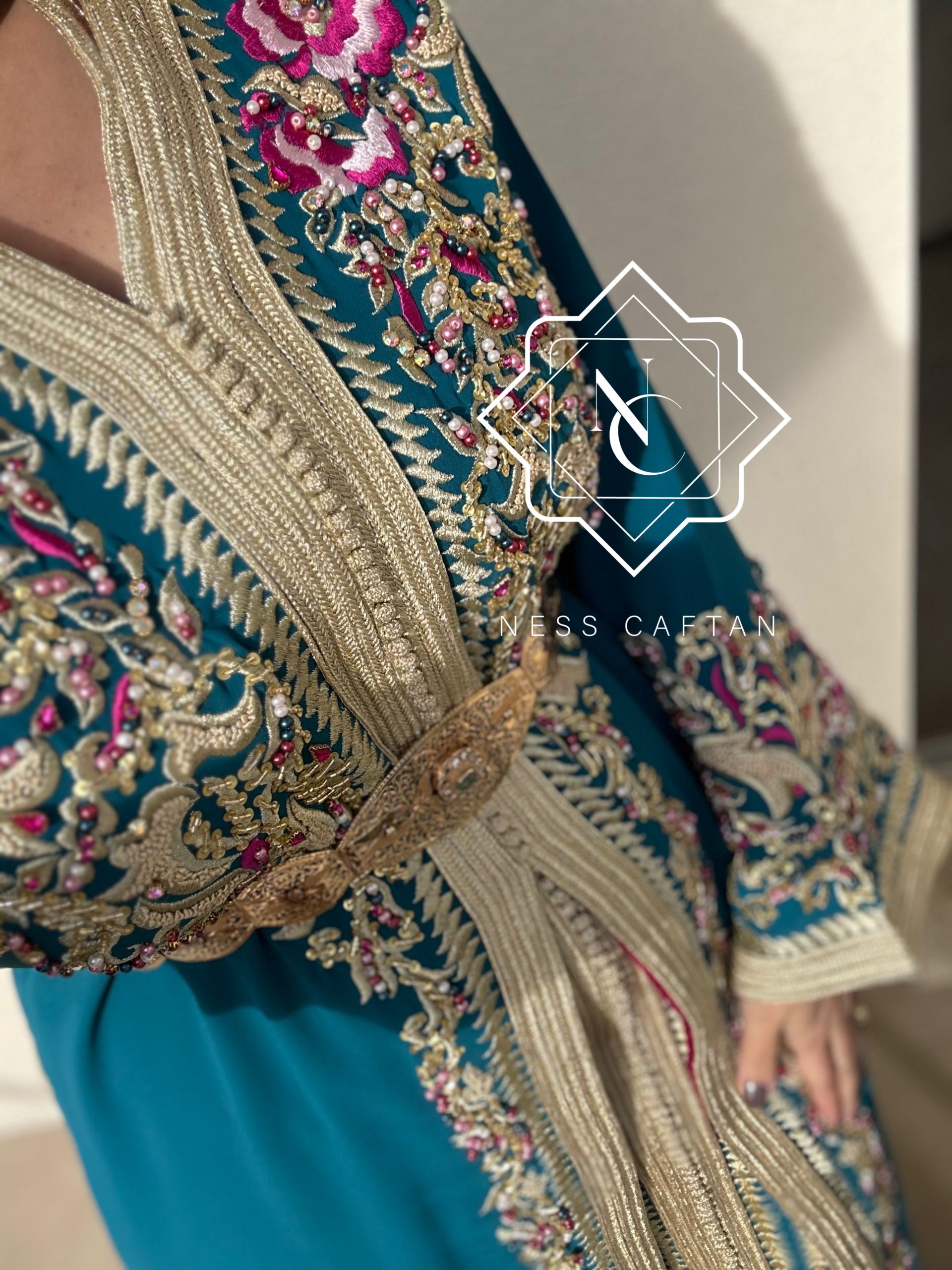 La takchita ESSRA est un modèle spectaculaire, brodé et perlé avec une finesse exceptionnelle. Le tissu en crêpe de soie fluide se mêle harmonieusement aux détails brodés et perlés, créant une pièce de grande élégance. Ce modèle, parfait pour un événement ou un mariage, combine sophistication et modernité. Les broderies et perles qui ornent cette takchita ajoutent une touche de glamour, tandis que la coupe parfaitement ajustée met en valeur la silhouette.